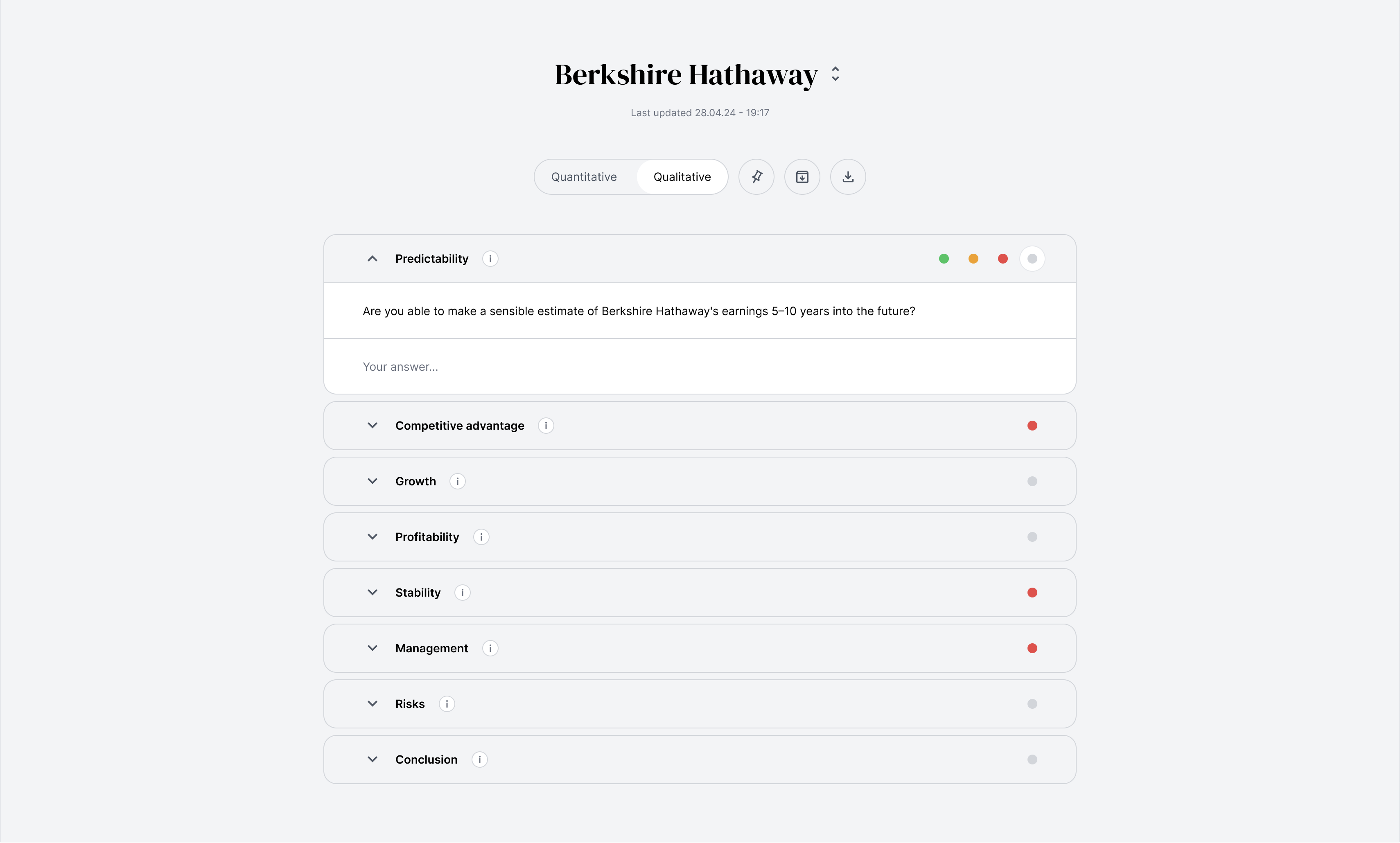 I created this tool to help me evaluate businesses and make smart investment decisions. The tool is designed to make the user think hard about his decisions and optimize for 10y look-through earnings.